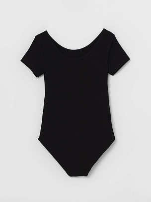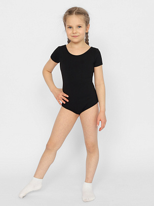 Купальник гимнастический с коротким рукавом. Вырез горловины и проймы ножек окантованы бейкой из основного полотна.
