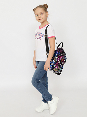 Футболка для девочки с трендовым колледж-принтом, с блестящим эффектом и контрастными бейками по горловине и рукавам. Модель сделана из 100%-хлопкового трикотажа. Материал приятно прилегает к телу, не сковывает движения и позволяет коже дышать.