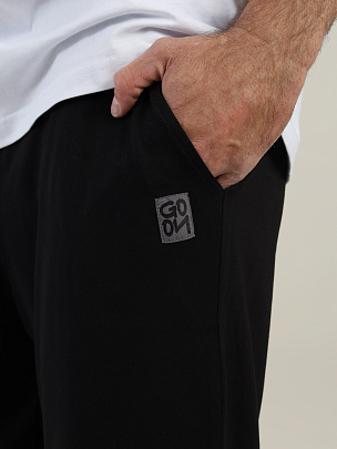 Брюки мужские прямые. Отрезной пояс выполнен из основного полотна. В поясе функциональный кругловязаный шнур вставлен в петли. Карманы наклонные с отрезным бочком. Декорированы жаккардовой этикеткой "продолжать".