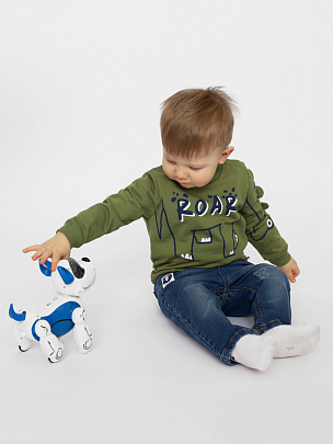 Джемпер для мальчика со спущеным плечом. Рукав втачной с манжетами. Боковые швы джемпера смещены на полочку, низ джемпера обработан поясом с разрезами. Воротник-стойка отложной. Манжеты и пояс выполнены из основного материала.