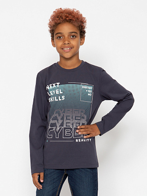 Водолазка для мальчика с воротником-стойкой, с отворотом. Рукава длинные с манжетами из основного полотна по низу. Перед водолазки декорирован принтом "Проследи свой путь".