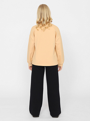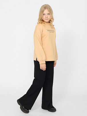 Джемпер для девочки с длинными рукавами и спущенными плечами. Горловина обработана воротником-стойкой из полотна с эластаном. Рукава с эластичными манжетами. Перед джемпера декорирован принтом.