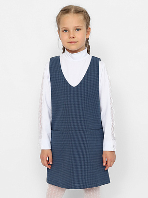 Сарафан для девочки выполнен из набивного футера - имитирует костюмную ткань. Школьный сарафан на широких бретелях без лишних застежек и замков имеет удобный А-силуэт. Добавление в состав эластана обеспечивает идеальную посадку и полную свободу движений. Спереди сарафана расположены прорезные карманы в шве. Сарафан удобно надевать поверх блузки, водолазки, джемпера или футболки, он будет актуален на протяжении всего учебного года.