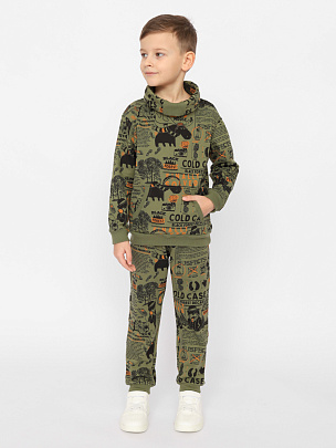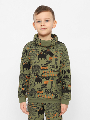 Толстовка с высоким воротником из основного полотна, карманом "кенгуру" и притачным поясом. Воротник спереди со вставкой из полотна с эластаном. Рукава длинные, с манжетами. Манжеты и пояс выполнены из полотна с эластаном.