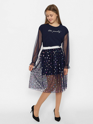 Нарядное платье свободного силуэта, с короткими рукавами. Нижний слой платья из хлопковой кулирки. Верхний слой платья из сетки с блестящими кружочками "конфетти". Сзади застежка на пуговицы.
