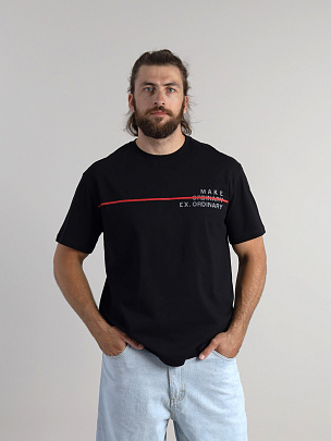 Футболка oversize со спущенным плечом, с коротким рукавом. Горловина круглая, обработана притачной бейкой из рибаны с лакрой. Плечевые швы смещены на перед и отстрочены. Перед оформлен принтом.